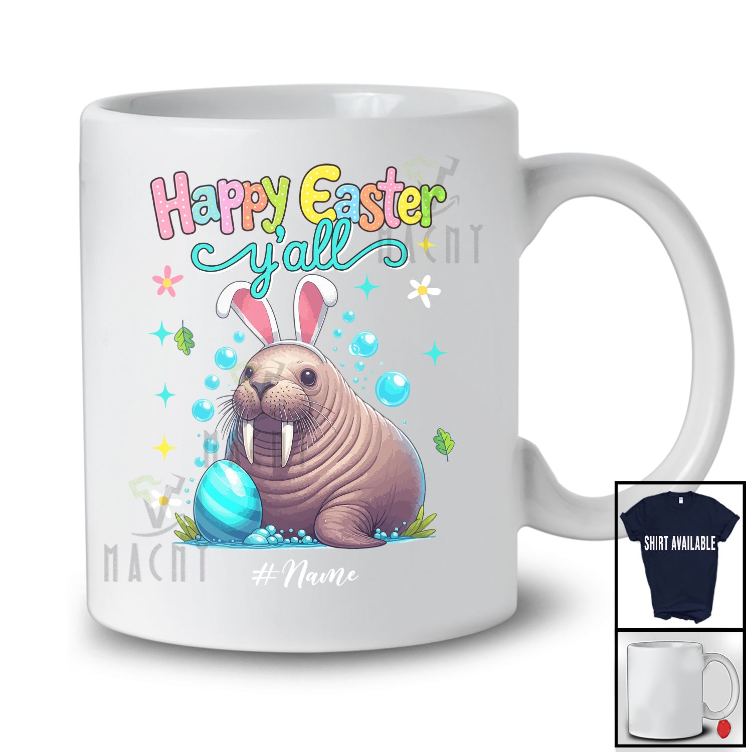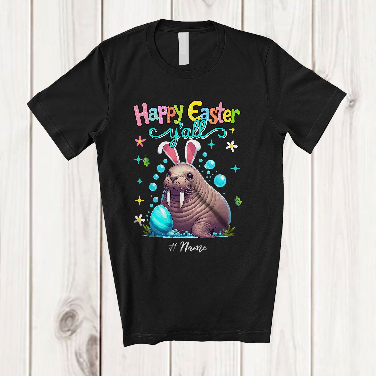 The Personalized Happy Easter Y'all; Adorable Custom Name Bunny Walrus Hunting Eggs; Sea Animal T-Shirt destined to impress, and priced at only $12.95, for a limited time.