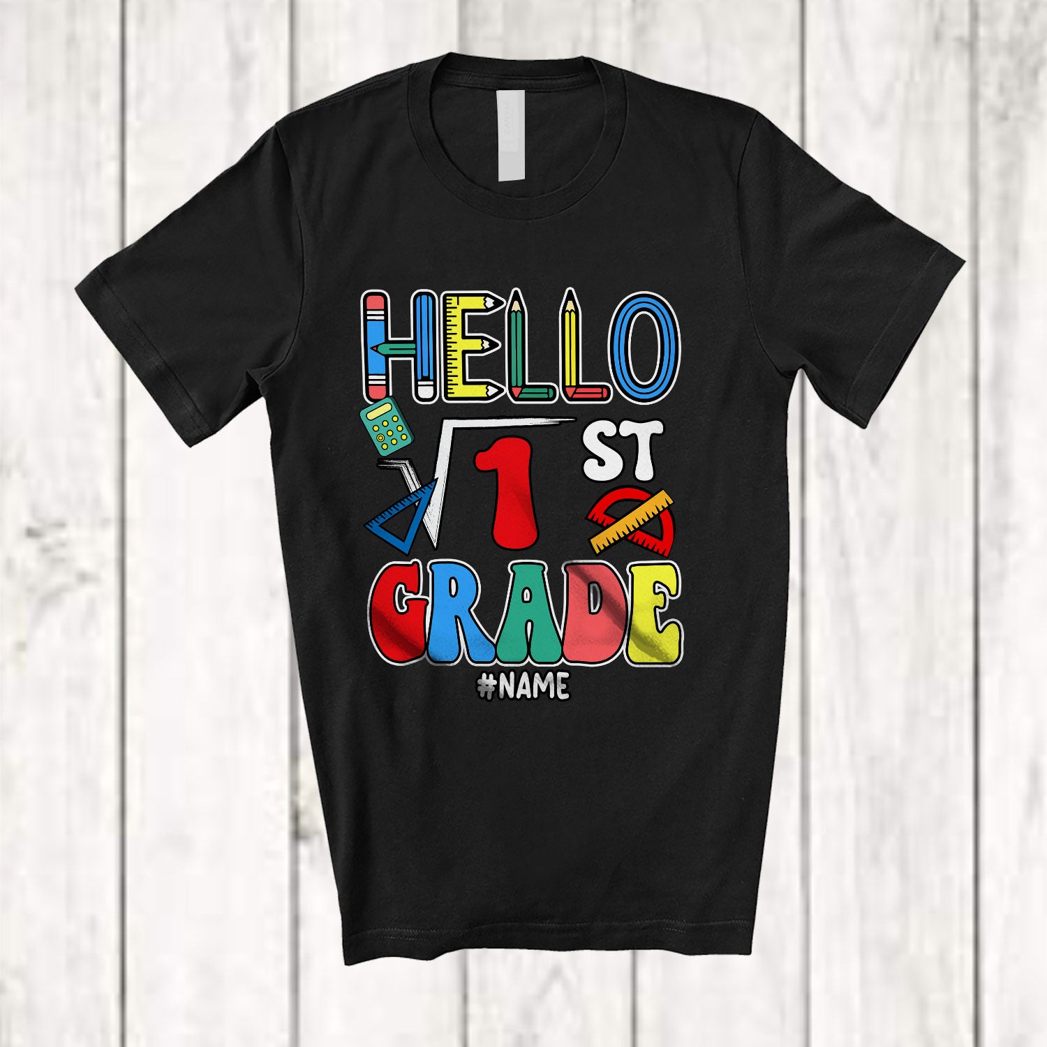 • Personalized Hello 1st Grade; Amazing Back To School Square of 1 Custom Name Math Teacher T-Shirt. This cotton t-shirt is a durable staple product with a classic fit. One of the most popular items, it has a relaxed style made for everyday and casual wear.