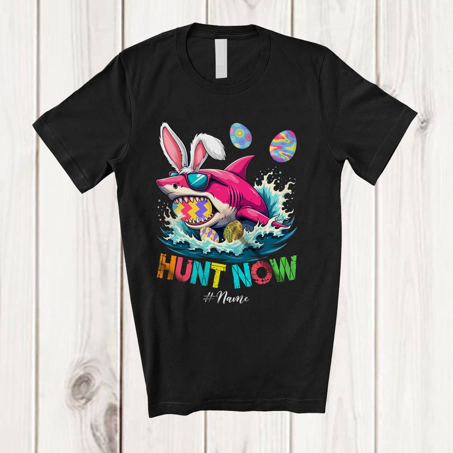 Personalized Hunt Now; Awesome Easter Bunny Shark Sunglasses Hunting Eggs; Family T-Shirt. This cotton t-shirt is a durable staple product with a classic fit. One of the most popular items, it has a relaxed style made for everyday and casual wear.