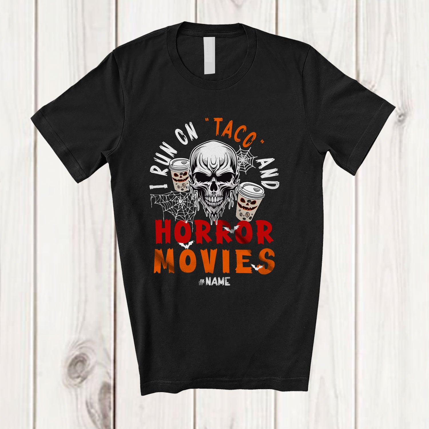 Personalized I Run On Coffee Horror Movies; Scary Halloween Custom Name Skull Coffee Lover T-Shirt