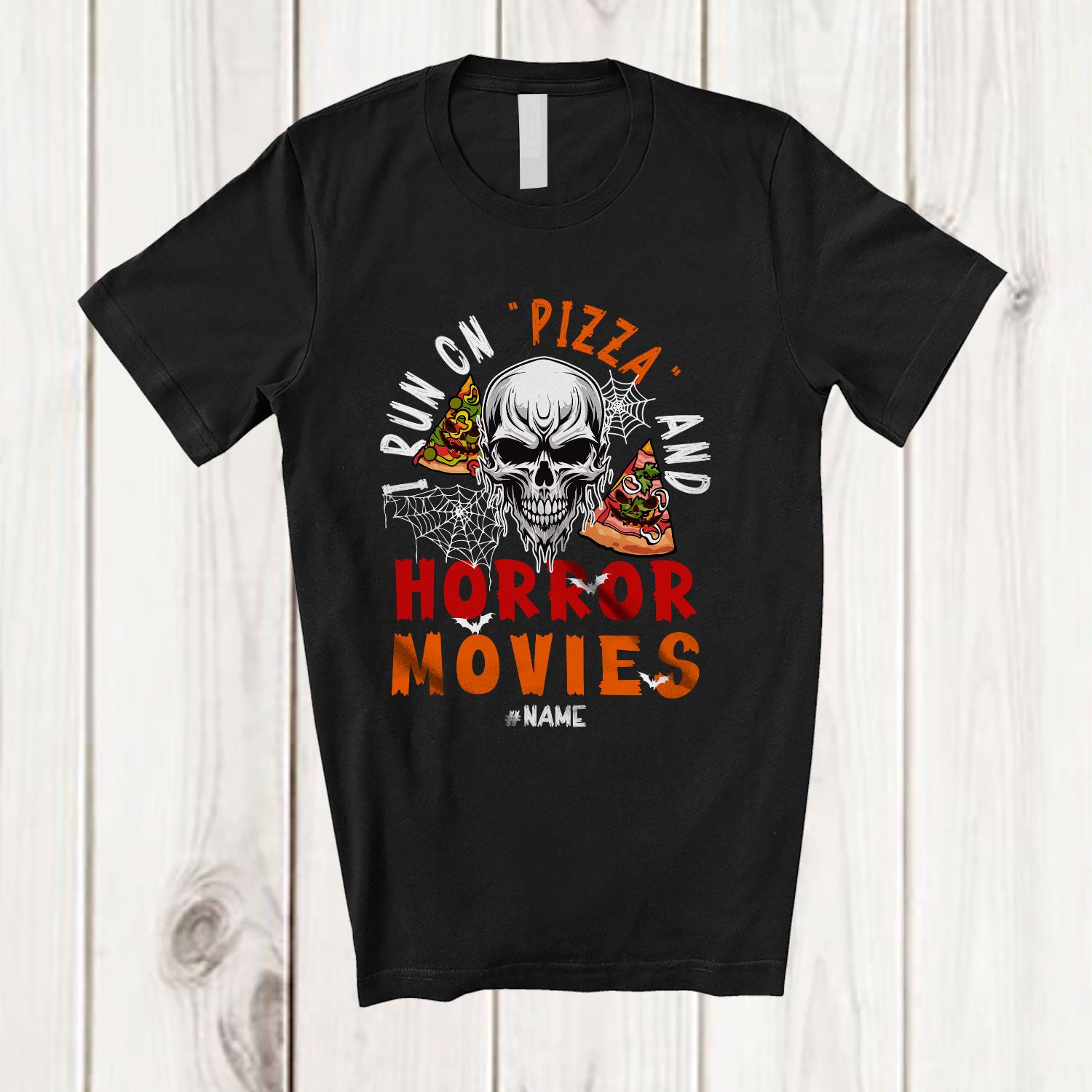 • Personalized I Run On Pizza Horror Movies; Scary Halloween Custom Name Skull Food Lover T-Shirt. This cotton t-shirt is a durable staple product with a classic fit. One of the most popular items, it has a relaxed style made for everyday and casual wear.
