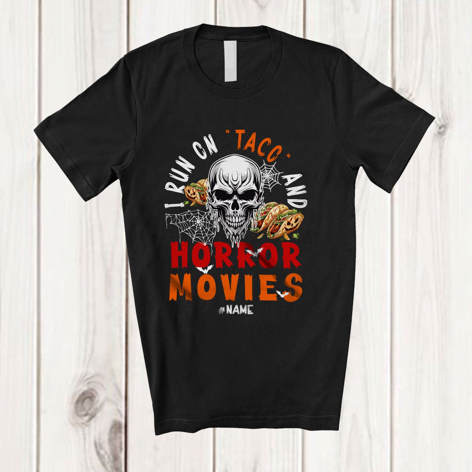• Personalized I Run On Taco Horror Movies; Scary Halloween Custom Name Skull Food Lover T-Shirt. This cotton t-shirt is a durable staple product with a classic fit. One of the most popular items, it has a relaxed style made for everyday and casual wear.