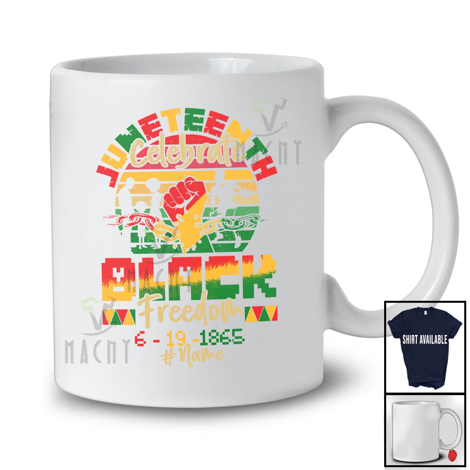 Personalized Juneteenth Celebrate Black Freedom; Proud Custom Name Black Afro Hand; Retro T-Shirt. This cotton t-shirt is a durable staple product with a classic fit. One of the most popular items, it has a relaxed style made for everyday and casual wear.