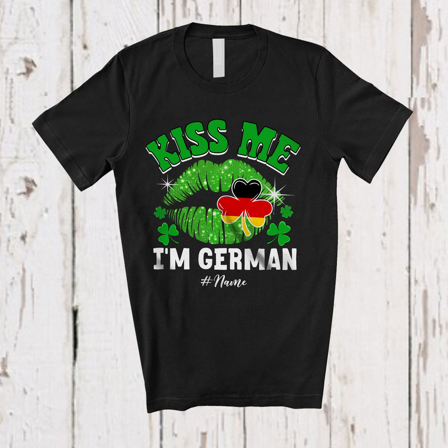 • Personalized Kiss me I'm German; Amazing St. Patrick's Day Lips; Custom Name German Flag Family T-Shirt. This cotton t-shirt is a durable staple product with a classic fit. One of the most popular items, it has a relaxed style made for everyday and casual wear.