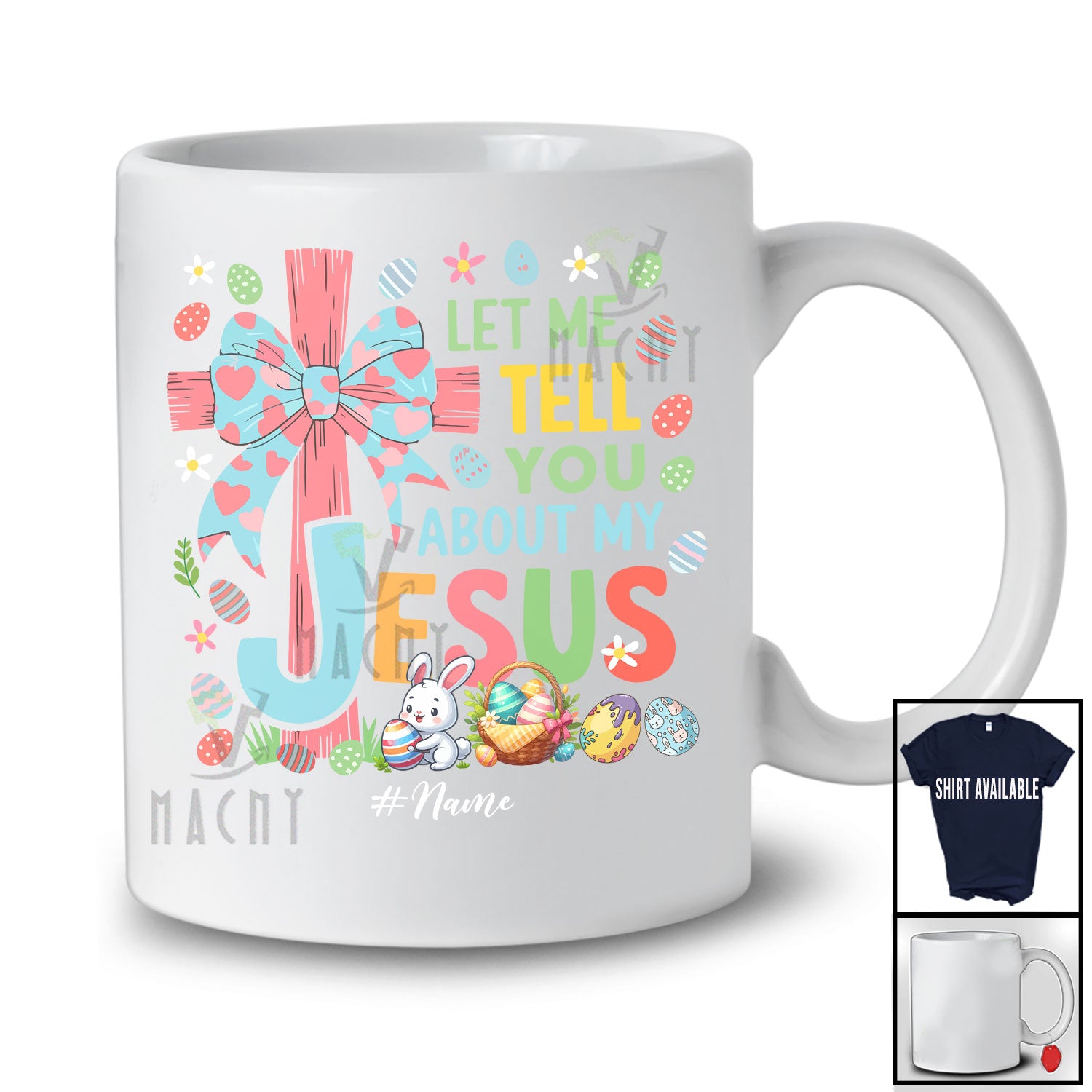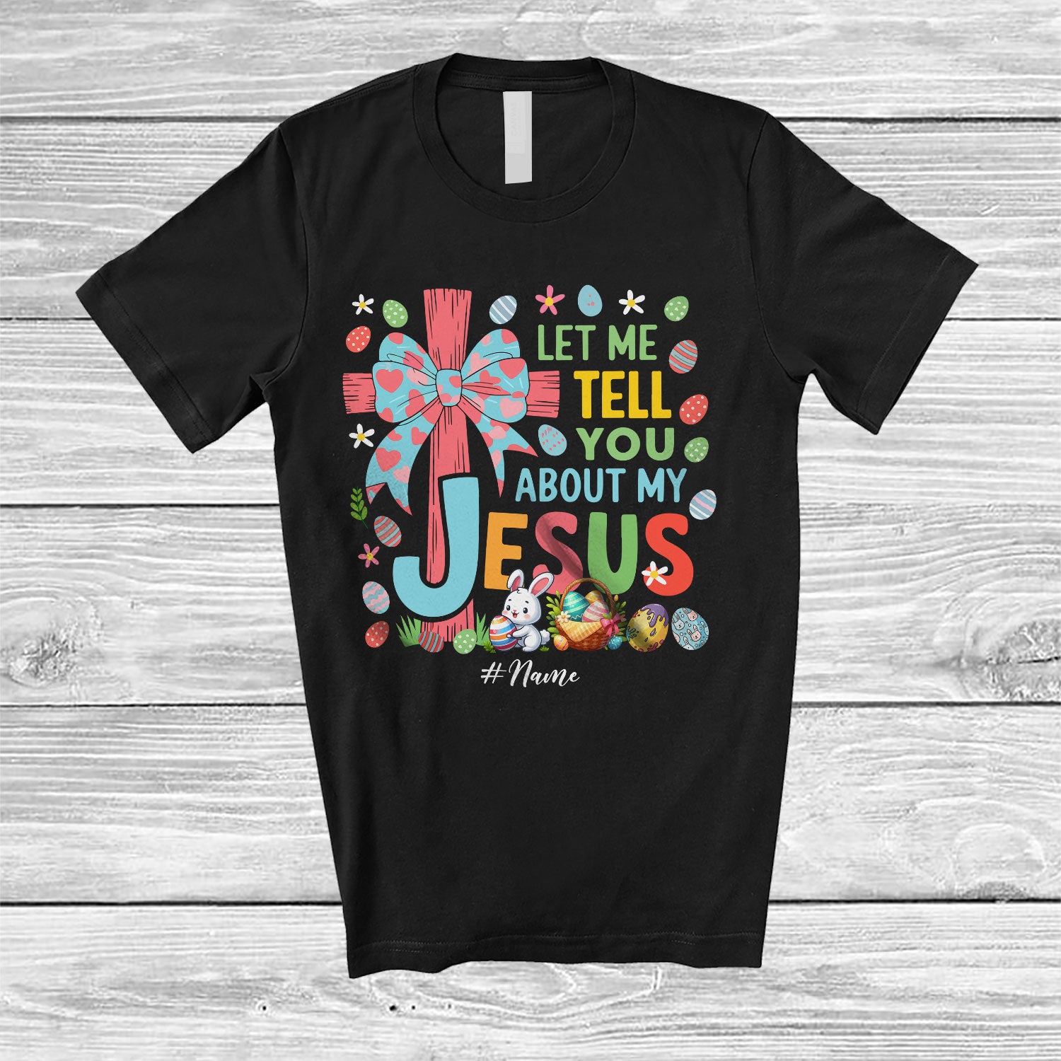 Personalized Let Me Tell You About My Jesus; Joyful Easter Custom Name Bunny; Cross Egg Hunt T-Shirt. This cotton t-shirt is a durable staple product with a classic fit. One of the most popular items, it has a relaxed style made for everyday and casual wear.