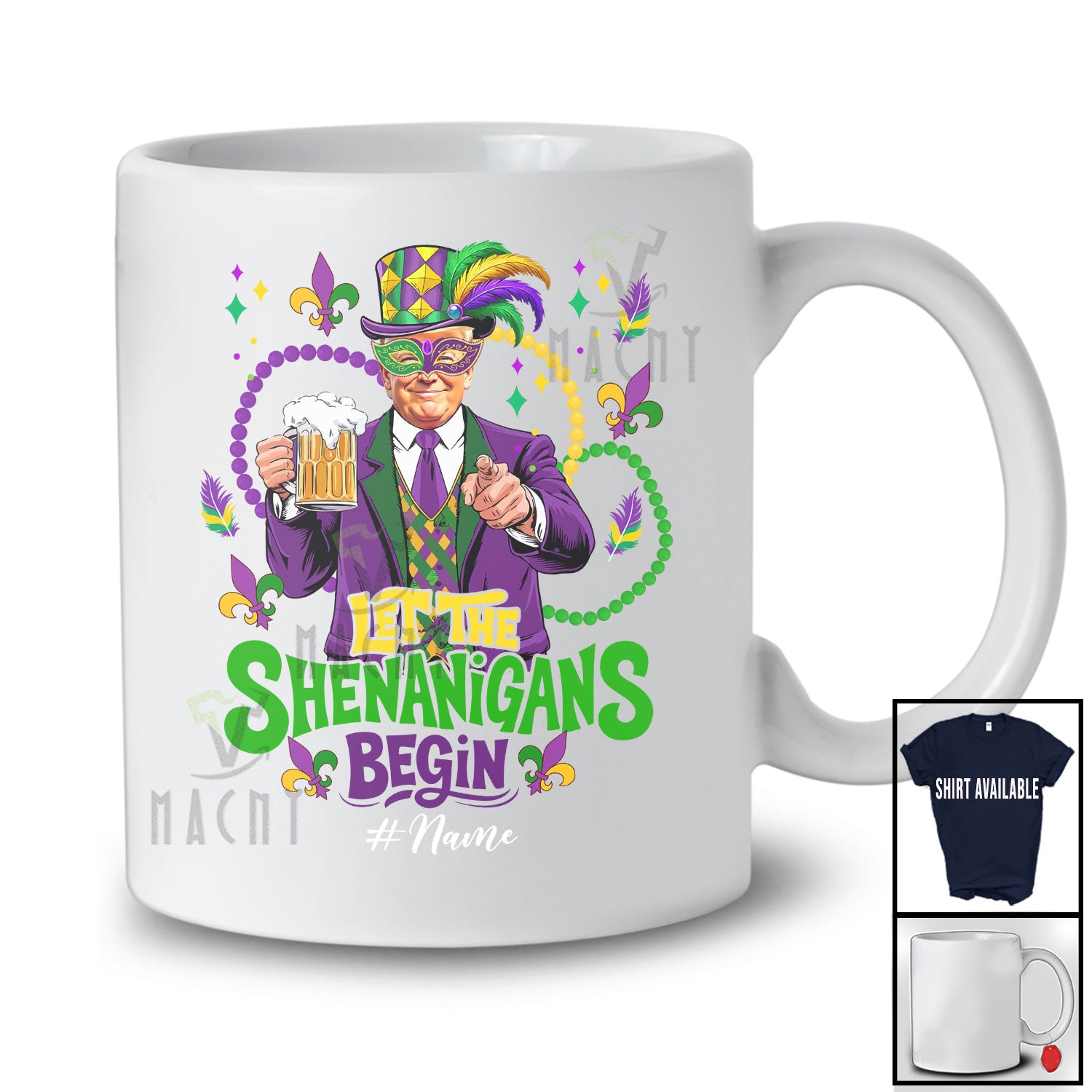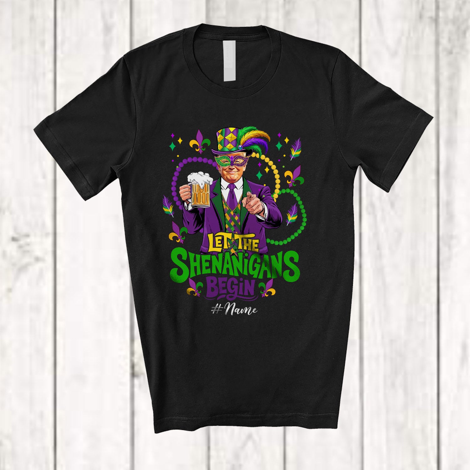 Personalized Let Shenanigans Begin; Joyful Mardi Gras Mask Trump Drinking; Custom Name Drunker T-Shirt