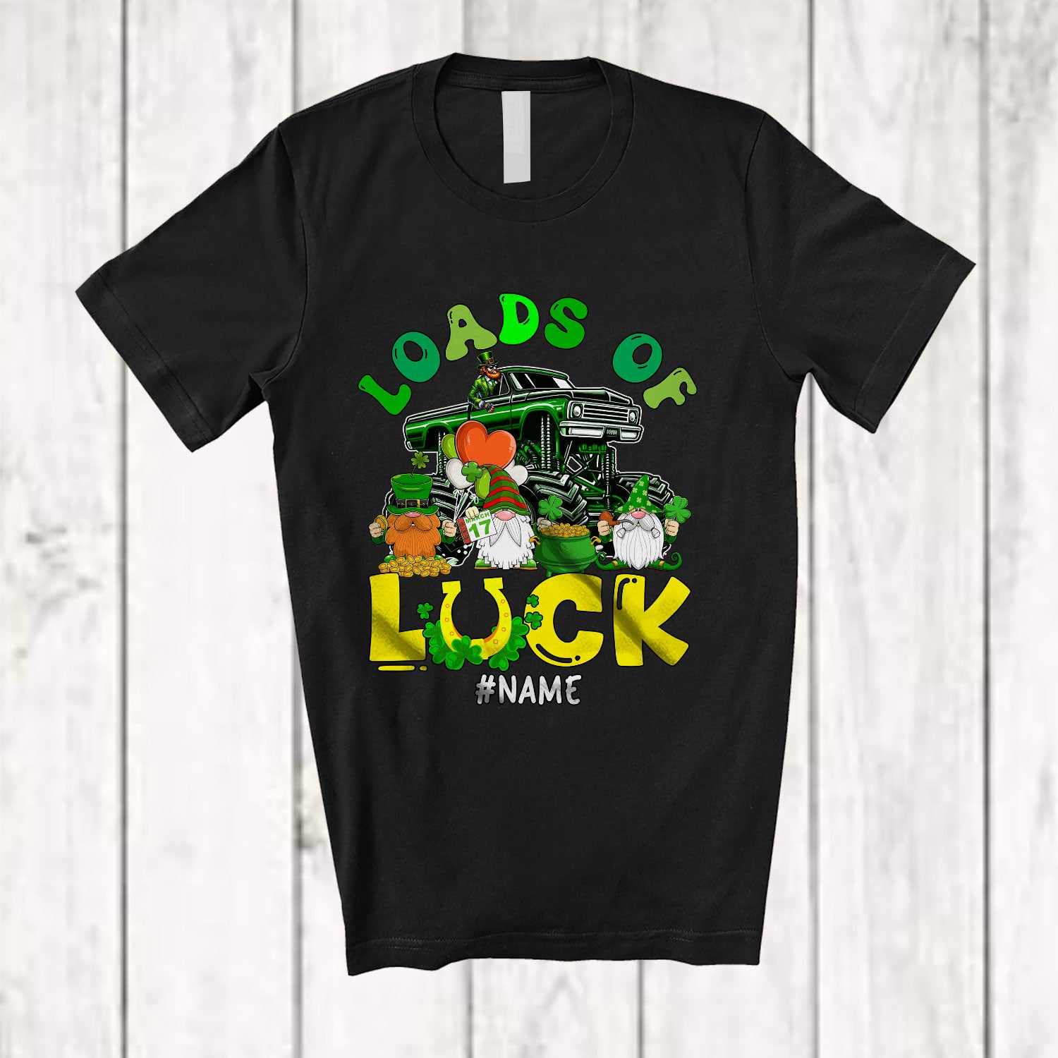 Personalized Loads Of Luck; Happy St. Patrick's Day Gnomes On Green Monster Truck; Shamrocks T-Shirt. This cotton t-shirt is a durable staple product with a classic fit. One of the most popular items, it has a relaxed style made for everyday and casual wear.