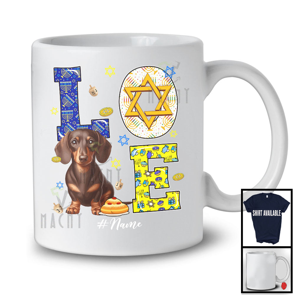 Personalized LOVE; Happy Hanukkah Decoration Custom Name Dachshund Owner; Family Group T-Shirt. This cotton t-shirt is a durable staple product with a classic fit. One of the most popular items, it has a relaxed style made for everyday and casual wear.