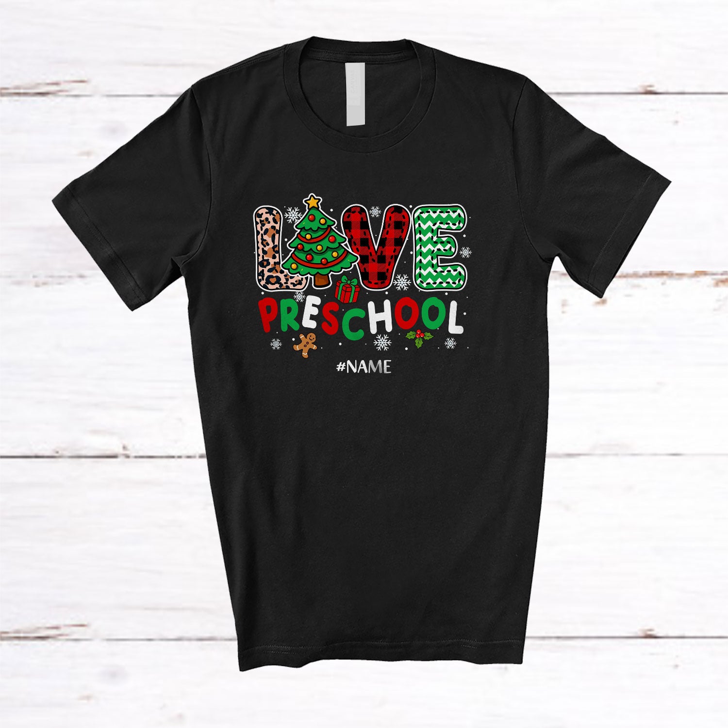 • Personalized LOVE Preschool; Merry Christmas Tree Plaid; Custom Name Student Teacher T-Shirt. This cotton t-shirt is a durable staple product with a classic fit. One of the most popular items, it has a relaxed style made for everyday and casual wear.