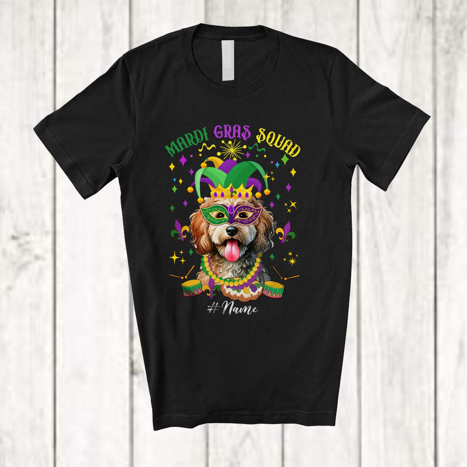 The Personalized Mardi Gras Squad; Adorable Custom Name Sproodle Face; Masked Jester Hat T-Shirt destined to impress, and priced at only $12.95, for a limited time.