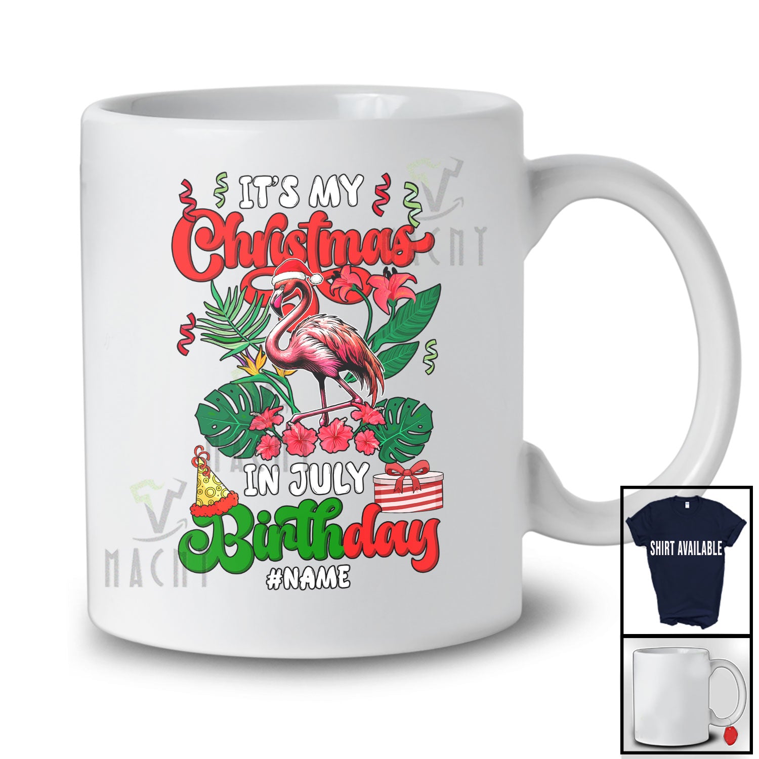 Personalized My Christmas In July Birthday; Joyful Summer Custom Name Flamingo Hawaiian Tropical T-Shirt. This cotton t-shirt is a durable staple product with a classic fit. One of the most popular items, it has a relaxed style made for everyday and casual wear.