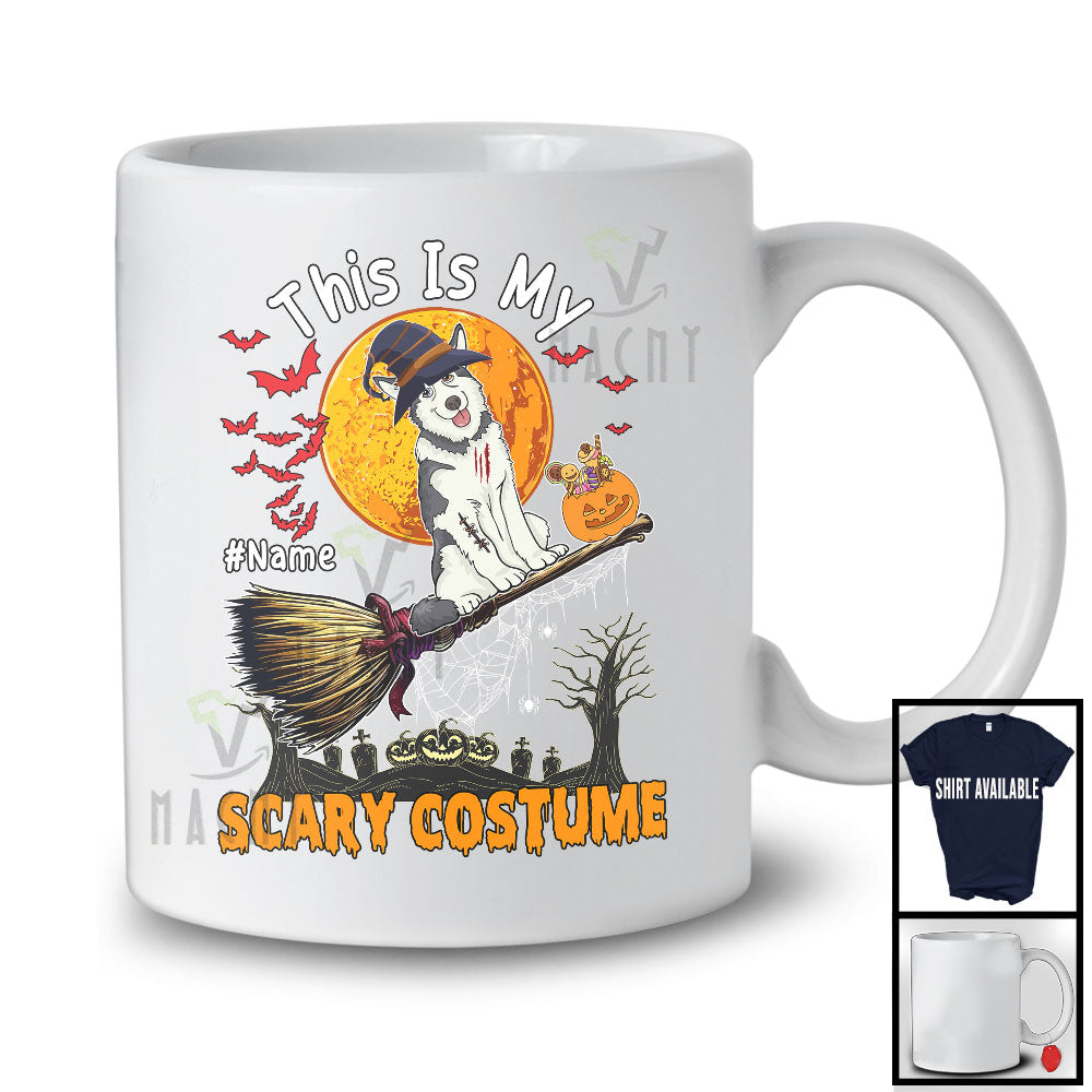 • Personalized My Scary Costume, Lovely Halloween Custom Name Husky, Witch Broom T-Shirt. This cotton t-shirt is a durable staple product with a classic fit. One of the most popular items, it has a relaxed style made for everyday and casual wear.