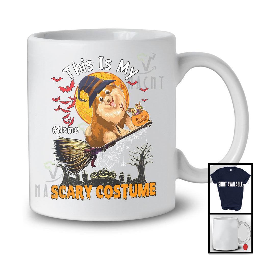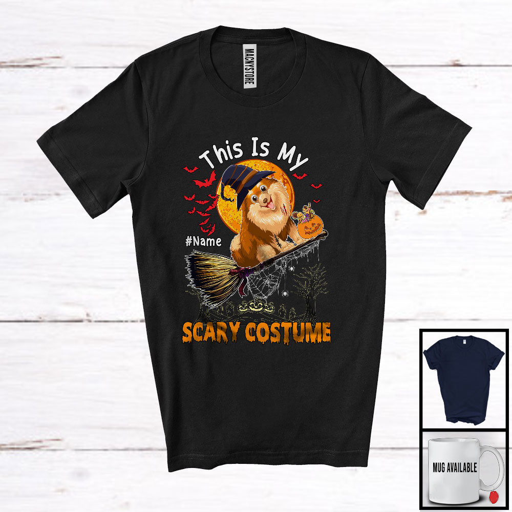 • Personalized My Scary Costume, Lovely Halloween Custom Name Pomeranian, Witch Broom T-Shirt. This cotton t-shirt is a durable staple product with a classic fit. One of the most popular items, it has a relaxed style made for everyday and casual wear.