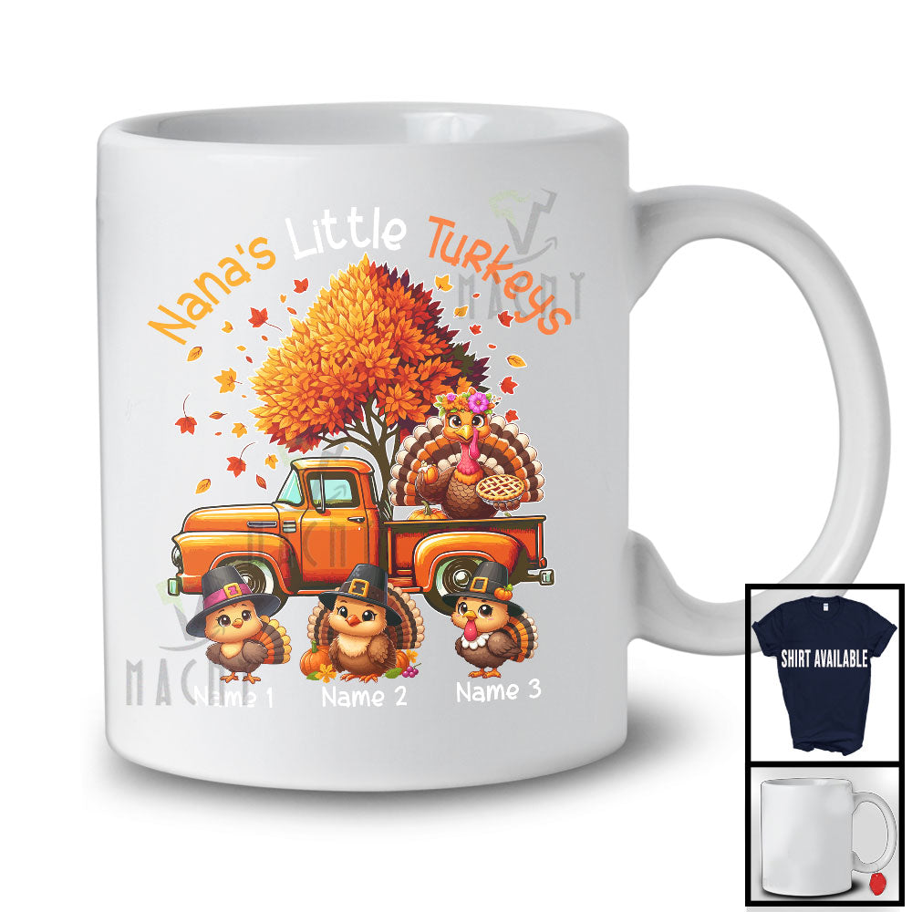 • Personalized Nana's Little Turkeys; Lovely Thanksgiving Fall Tree Pickup Truck; Family T-Shirt. This cotton t-shirt is a durable staple product with a classic fit. One of the most popular items, it has a relaxed style made for everyday and casual wear.