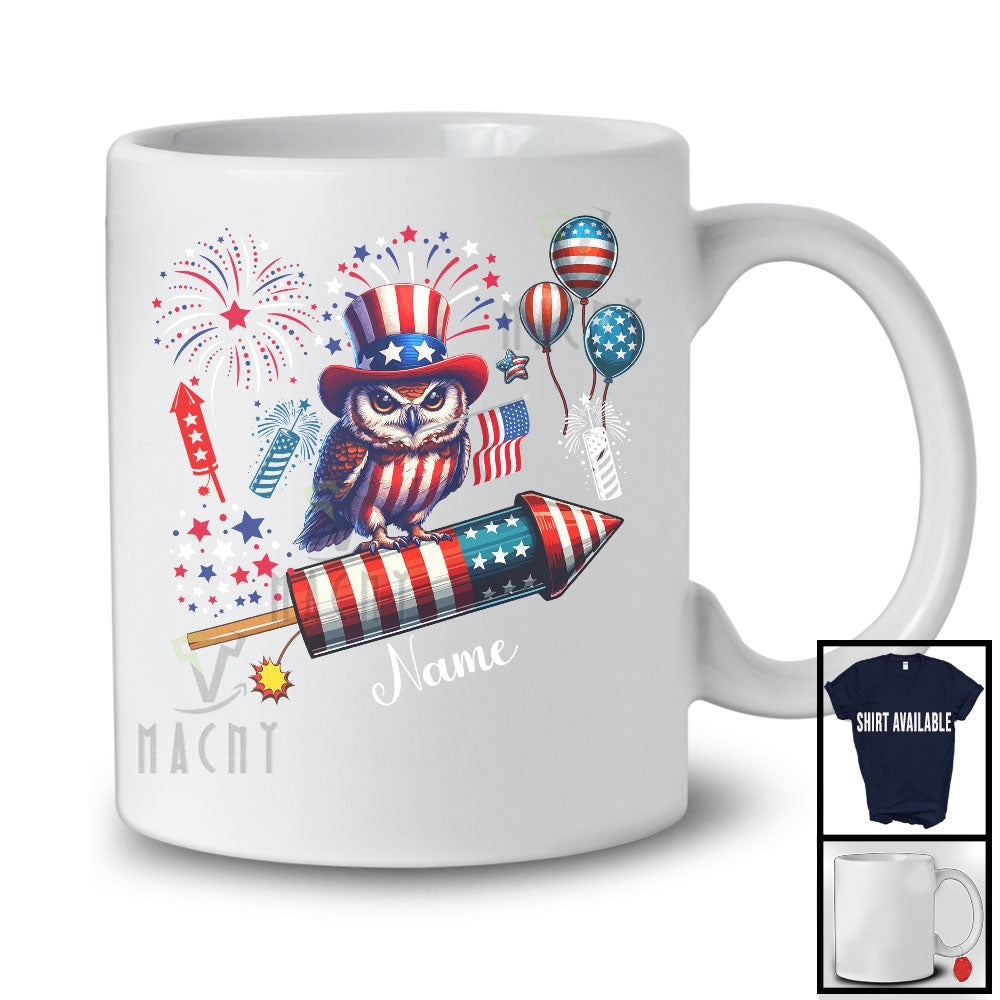 Personalized Owl Riding Firecracker, Lovely 4th Of July USA Flag Custom Name, Bird Animal T-Shirt