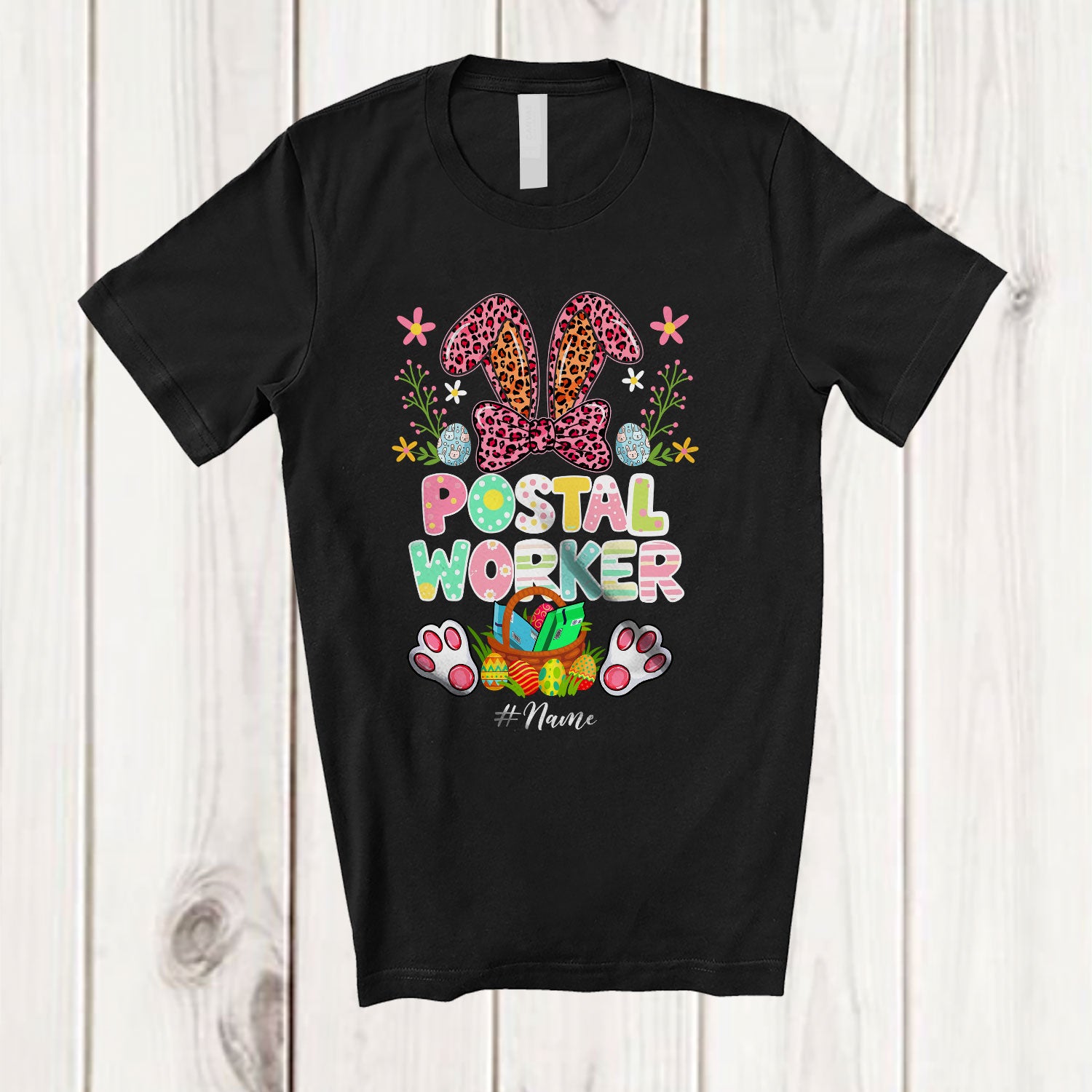 Personalized Postal Worker; Proud Easter Flowers Leopard Bunny; Custom Name Postal Worker Family T-Shirt. This cotton t-shirt is a durable staple product with a classic fit. One of the most popular items, it has a relaxed style made for everyday and casual wear.