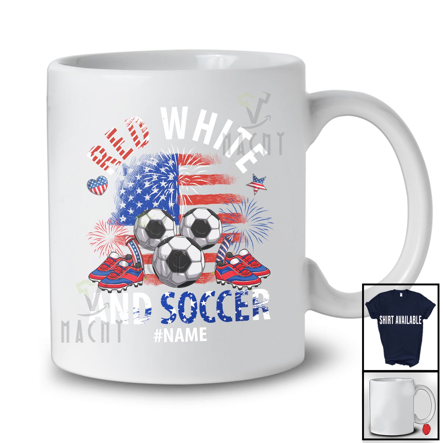 Personalized Red White And Soccer; Amusing 4th Of July US Flag; Custom Name Player Patriotic T-Shirt. This cotton t-shirt is a durable staple product with a classic fit. One of the most popular items, it has a relaxed style made for everyday and casual wear.