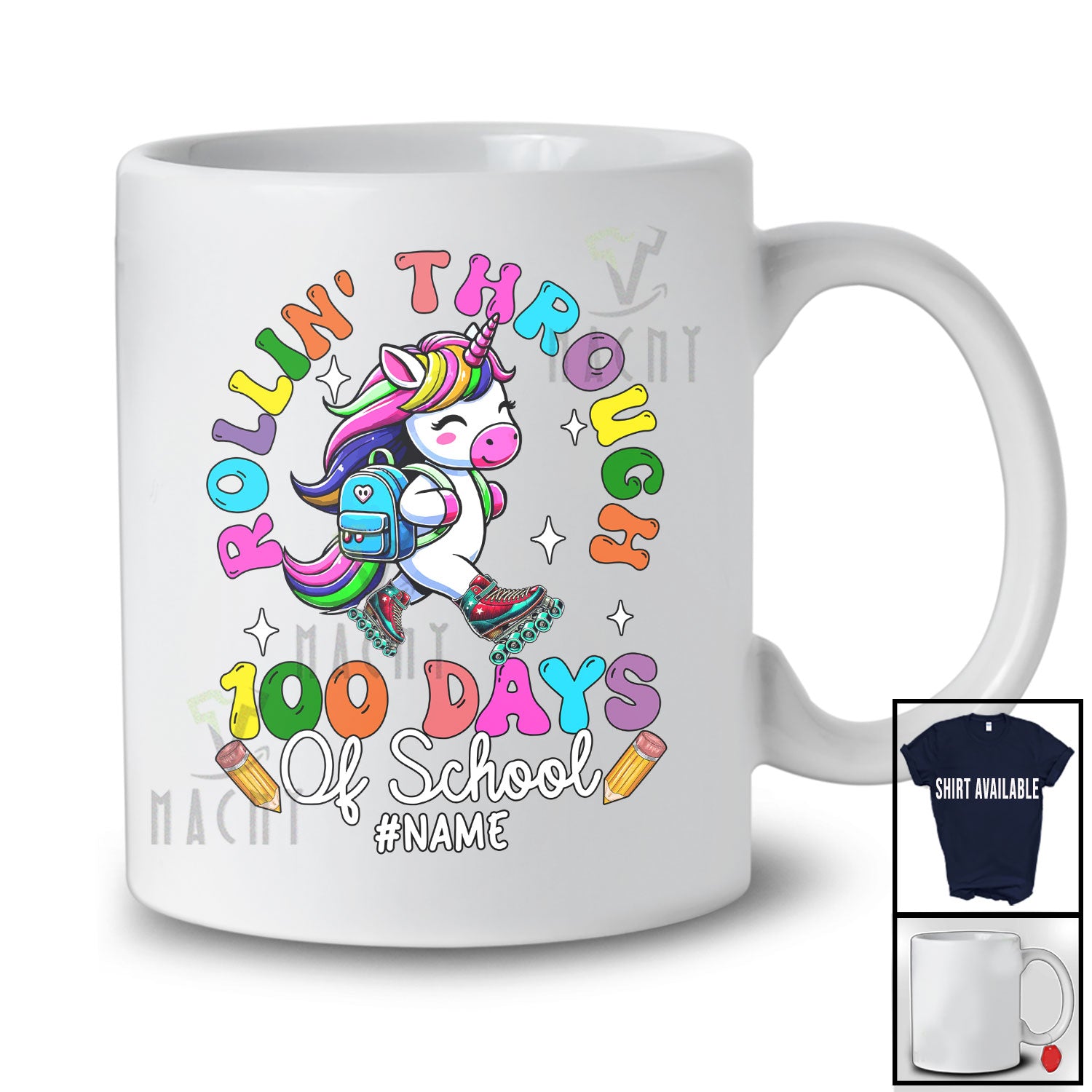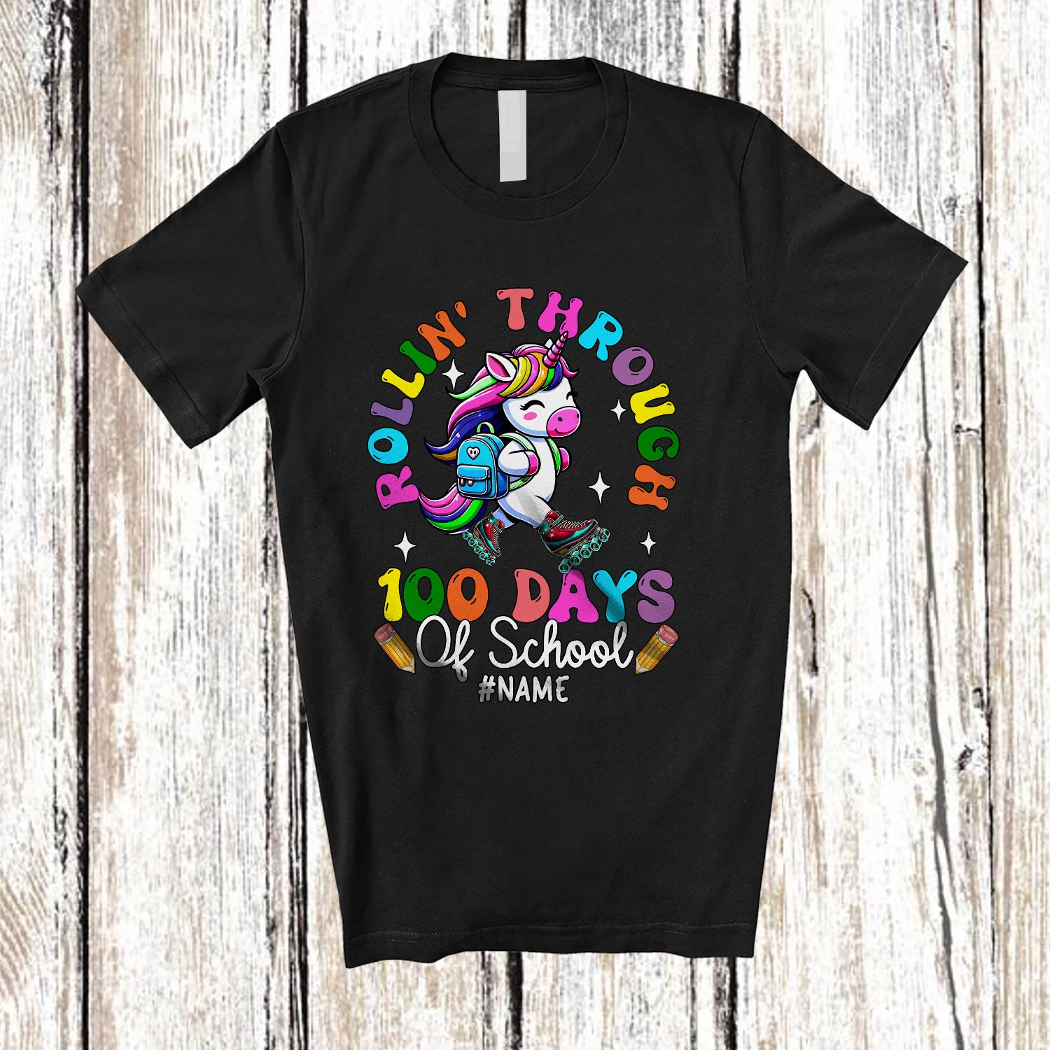 Personalized Rollin' Through 100 Days Of School; Adorable Custom Name Unicorn; Students Teacher T-Shirt. This cotton t-shirt is a durable staple product with a classic fit. One of the most popular items, it has a relaxed style made for everyday and casual wear.