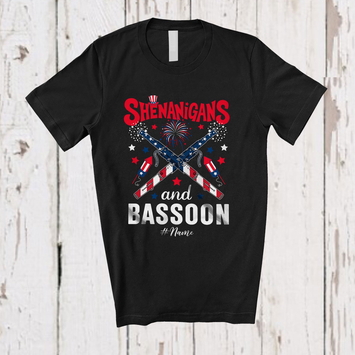 • Personalized Shenanigans And Bassoon; Lovely 4th Of July Custom Name Bassoon Player; Patriotic T-Shirt. This cotton t-shirt is a durable staple product with a classic fit. One of the most popular items, it has a relaxed style made for everyday and casual wear.