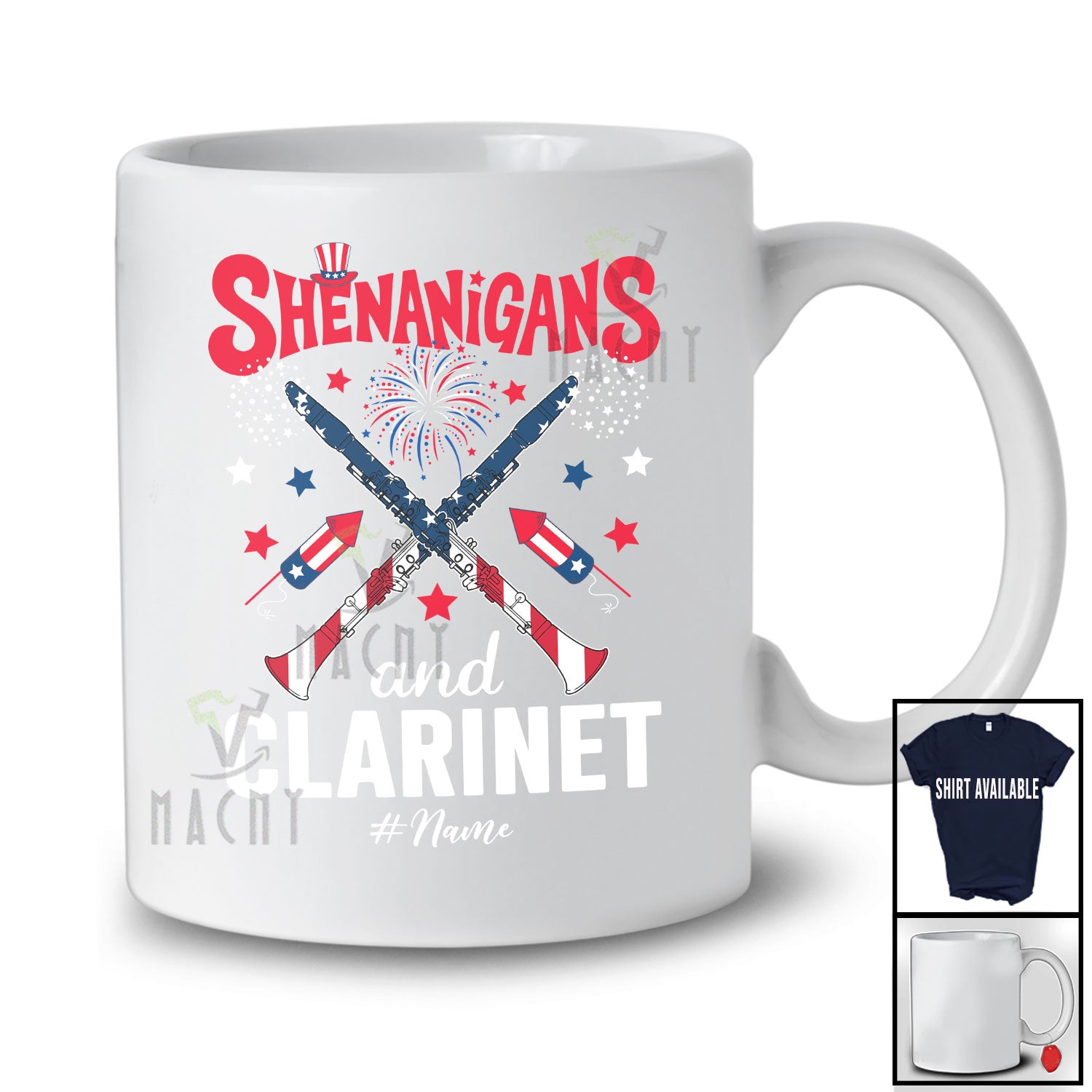 • Personalized Shenanigans And Clarinet; Lovely 4th Of July Custom Name Clarinet Player; Patriotic T-Shirt. This cotton t-shirt is a durable staple product with a classic fit. One of the most popular items, it has a relaxed style made for everyday and casual wear.