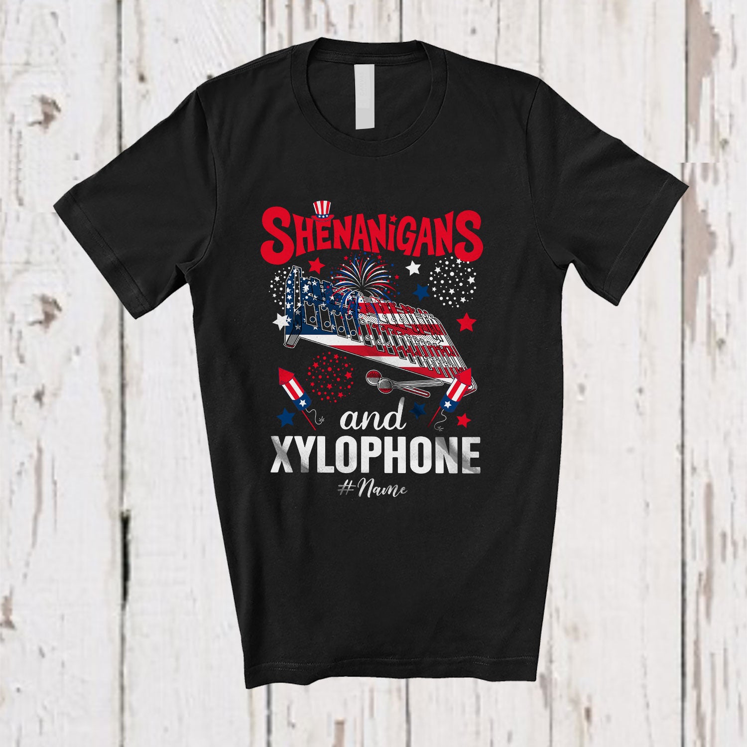 Personalized Shenanigans And Xylophone; Lovely 4th Of July Custom Name Xylophone Player; Patriotic T-Shirt. This cotton t-shirt is a durable staple product with a classic fit. One of the most popular items, it has a relaxed style made for everyday and casual wear.