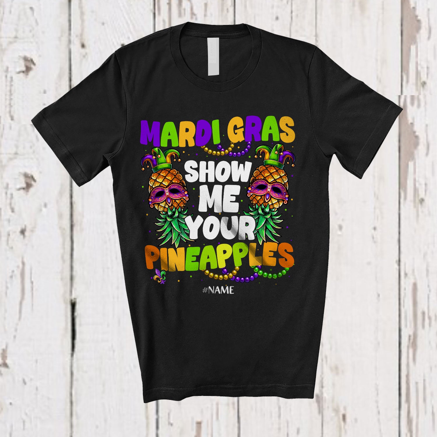 Personalized Show Me Your Pineapples; Humorous Mardi Gras Beads Fruit; Custom Name Parades T-Shirt. This cotton t-shirt is a durable staple product with a classic fit. One of the most popular items, it has a relaxed style made for everyday and casual wear.