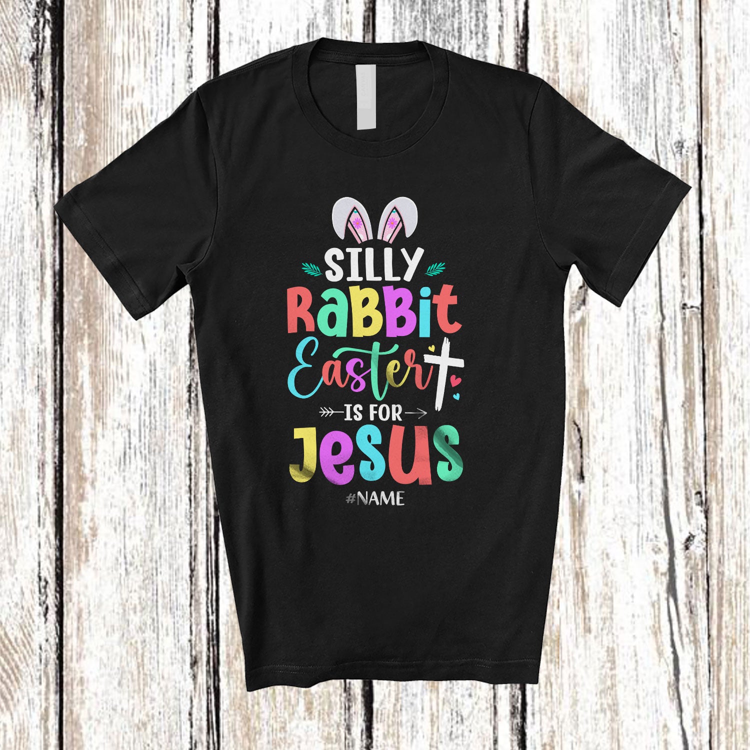 Personalized Silly Rabbit Easter Is For Jesus; Lovely Custom Name Bunny Flowers; Egg Hunt T-Shirt. This cotton t-shirt is a durable staple product with a classic fit. One of the most popular items, it has a relaxed style made for everyday and casual wear.