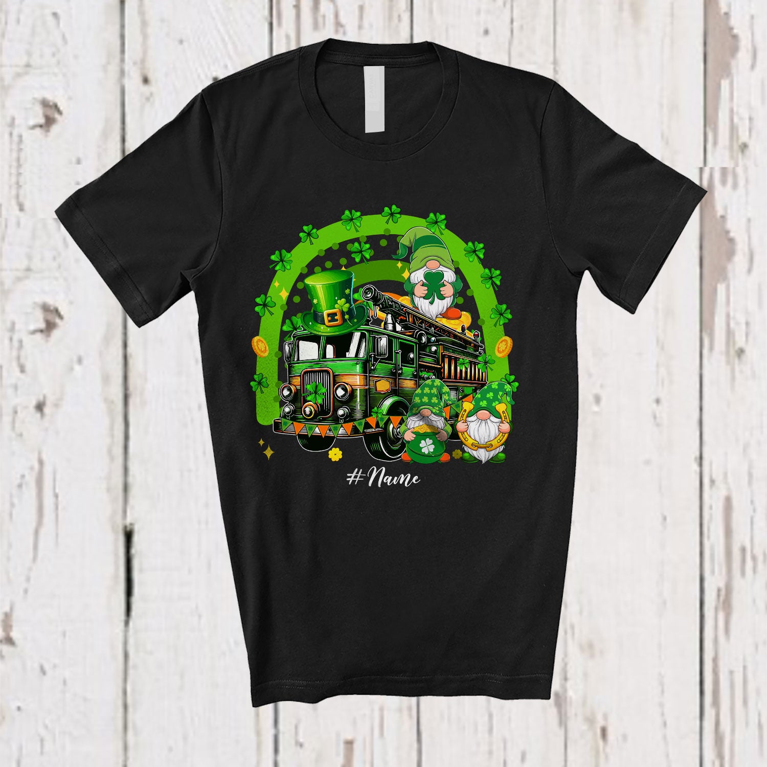 Personalized Three Gnomes With Fire Truck; Happy St. Patrick's Day Rainbow; Custom Name Family T-Shirt. This cotton t-shirt is a durable staple product with a classic fit. One of the most popular items, it has a relaxed style made for everyday and casual wear.