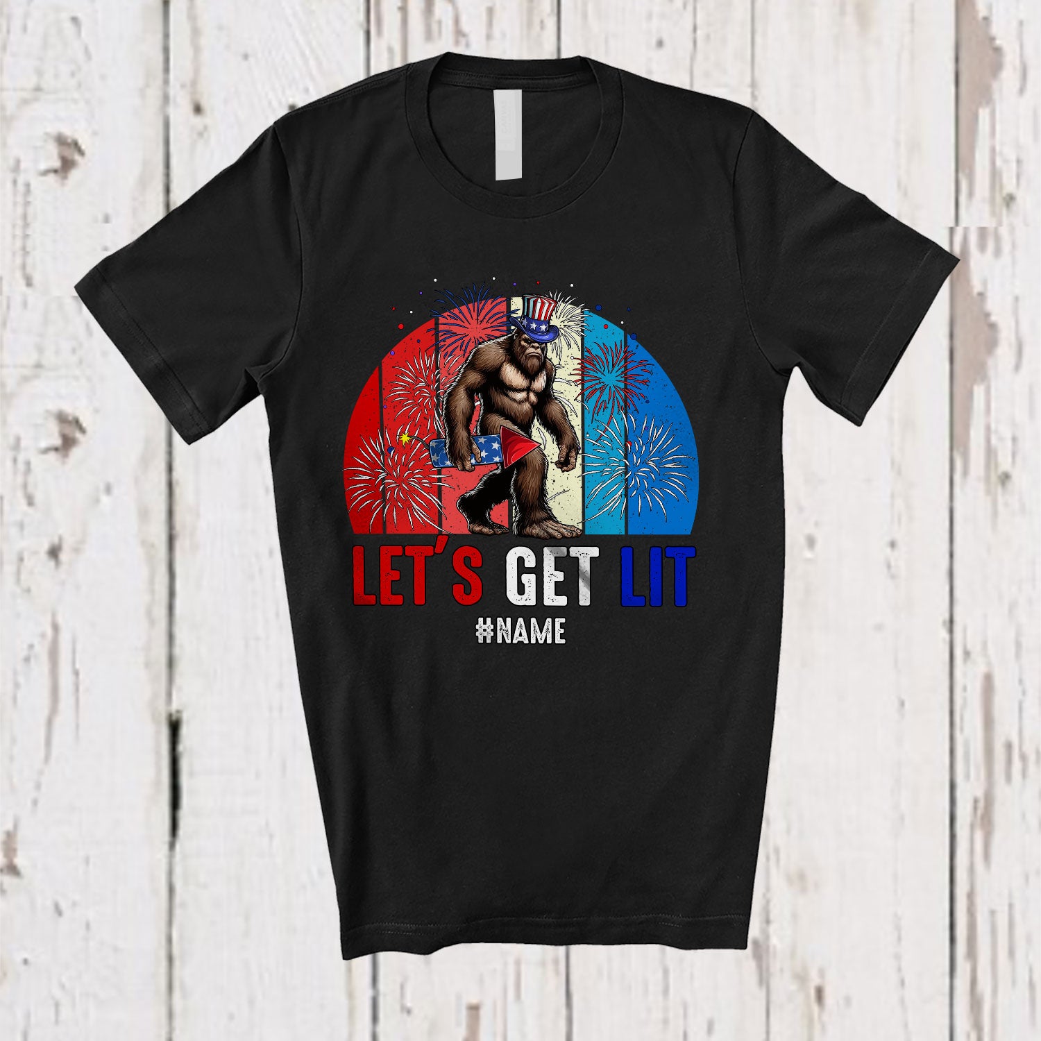Personalized Vintage Retro Let's Get Lit; Proud 4th Of July Custom Name Bigfoot Firecracker T-Shirt