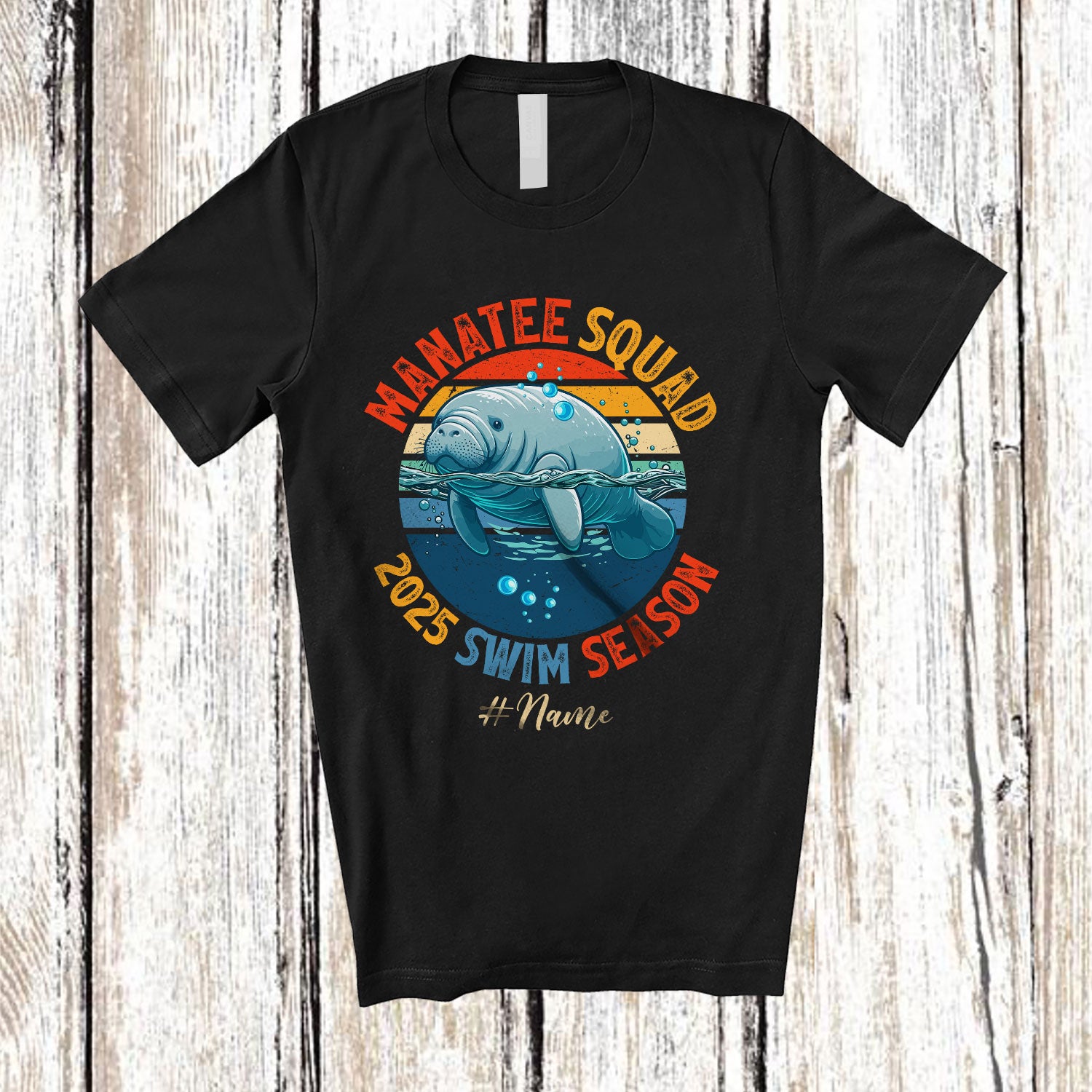 Personalized Vintage Retro Manatee Squad 2025 Swim Season; Lovely Custom Name Swimming T-Shirt