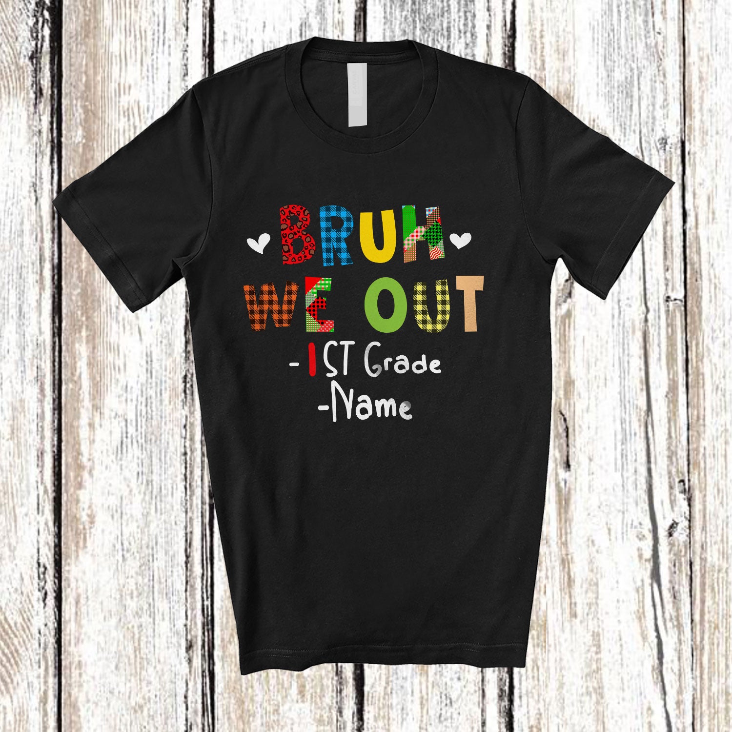 • Personalized We Out 1st Grade; Lovely Last Day Of School Plaid Custom Name Students Teacher T-Shirt. This cotton t-shirt is a durable staple product with a classic fit. One of the most popular items, it has a relaxed style made for everyday and casual wear.