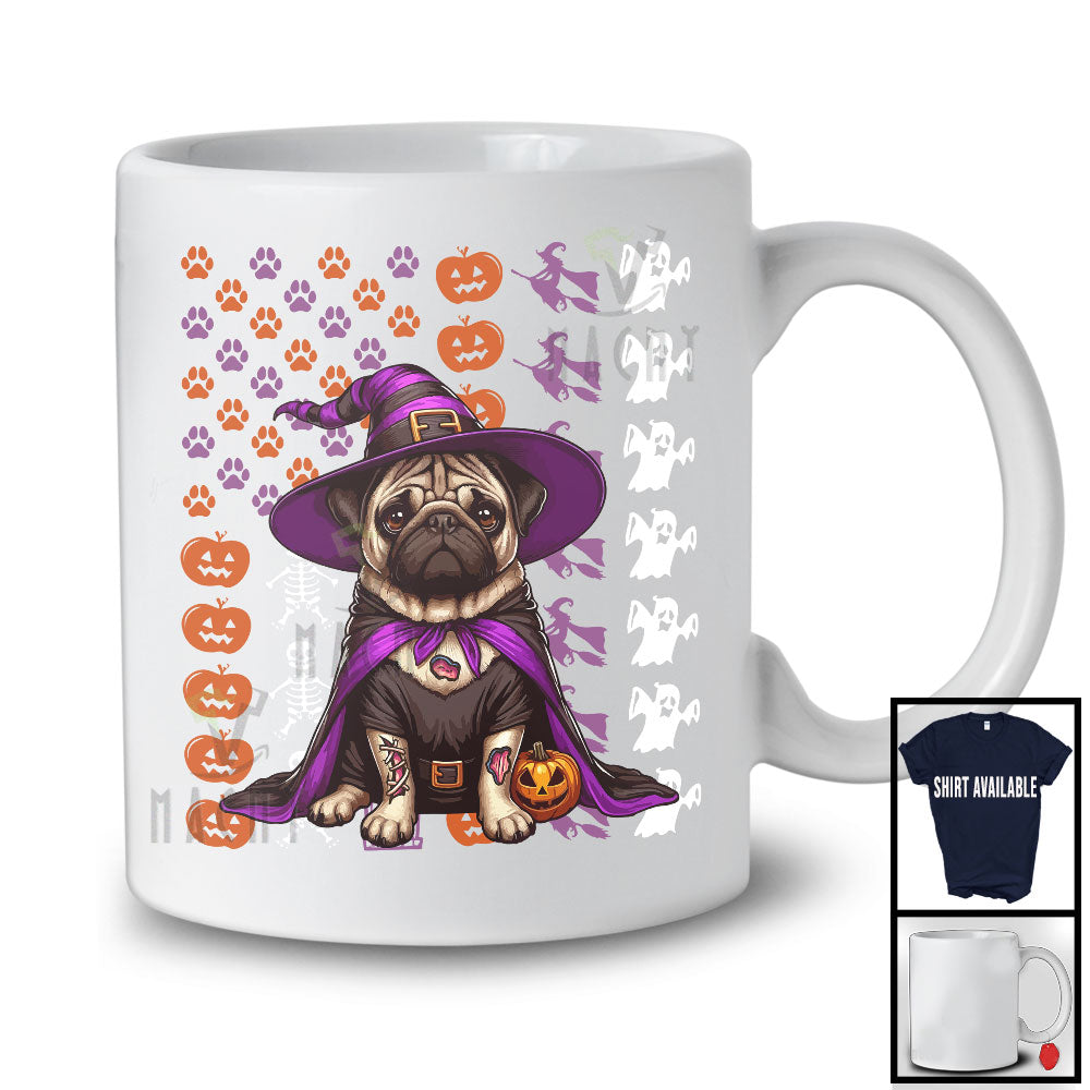 Pug Witch On American Flag, Adorable Halloween Pumpkin Paws, Patriotic Group T-Shirt. This cotton t-shirt is a durable staple product with a classic fit. One of the most popular items, it has a relaxed style made for everyday and casual wear.