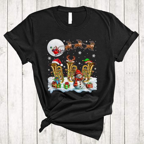 Santa ELF Reindeer Tuba Player, Joyful Christmas Musical Instruments, Snow Around Snowman T-Shirt