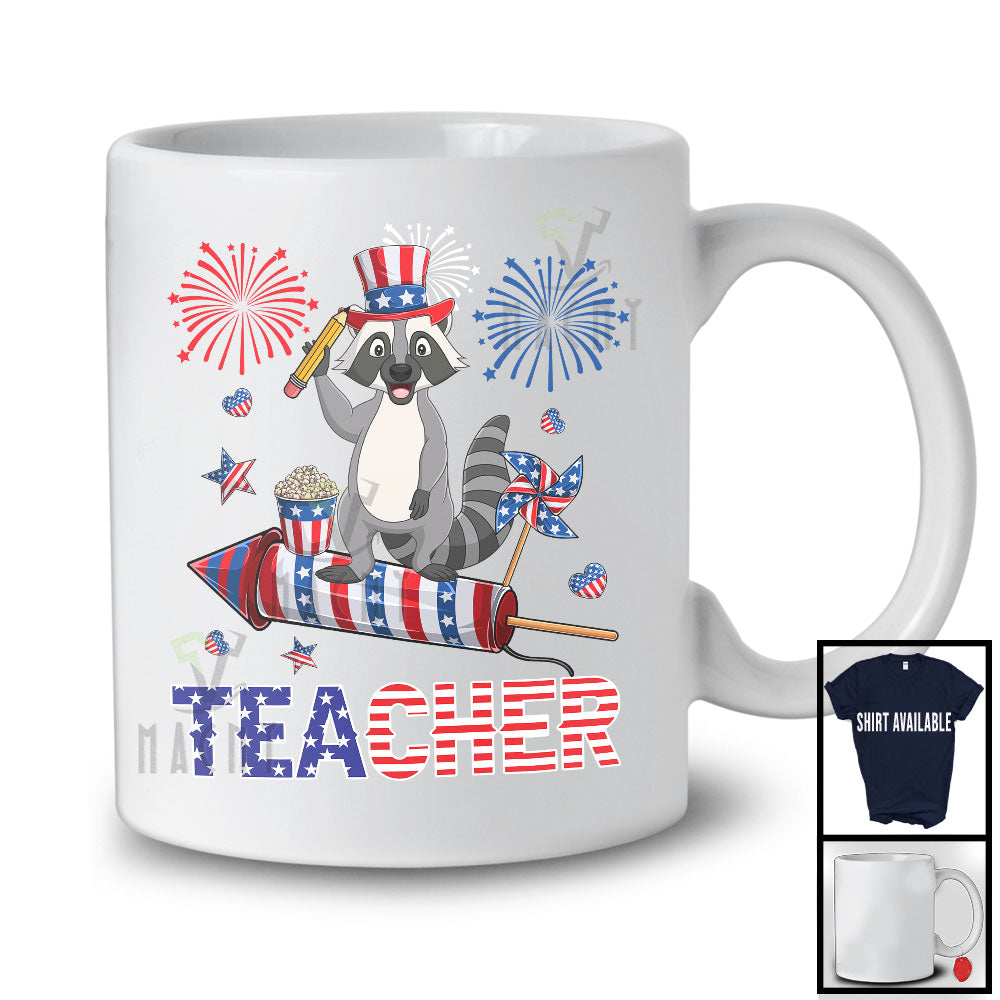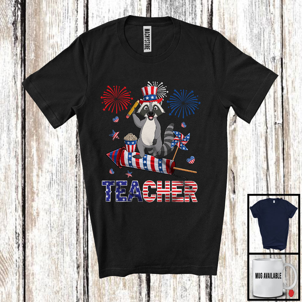 Teacher, Adorable 4th Of July Raccoon With Fireworks, American Flag Farm Farmer Patriotic T-Shirt
