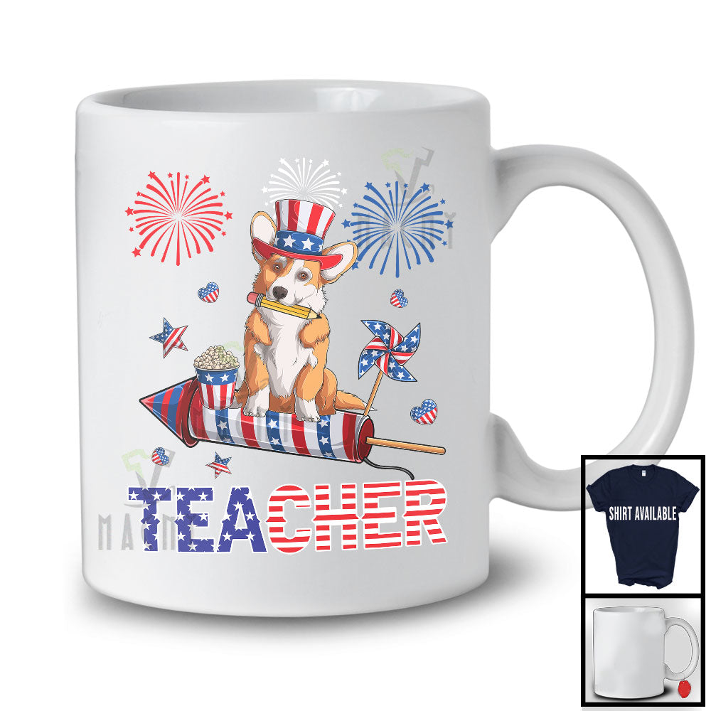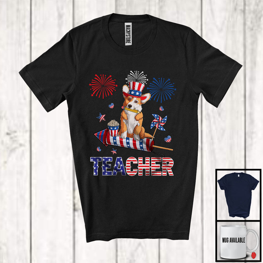 The Teacher, Lovely 4th Of July Corgi With Fireworks, American Flag Patriotic Teacher T-Shirt destined to impress, and priced at only $12.95, for a limited time.