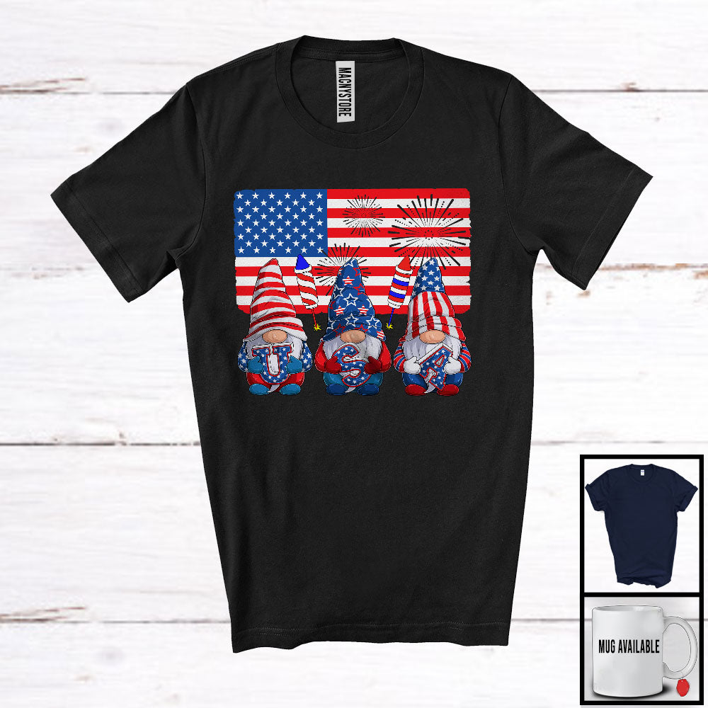 Three Gnomes With American Flag, Amazing 4th Of July Firecrackers, USA Patriotic Group T-Shirt