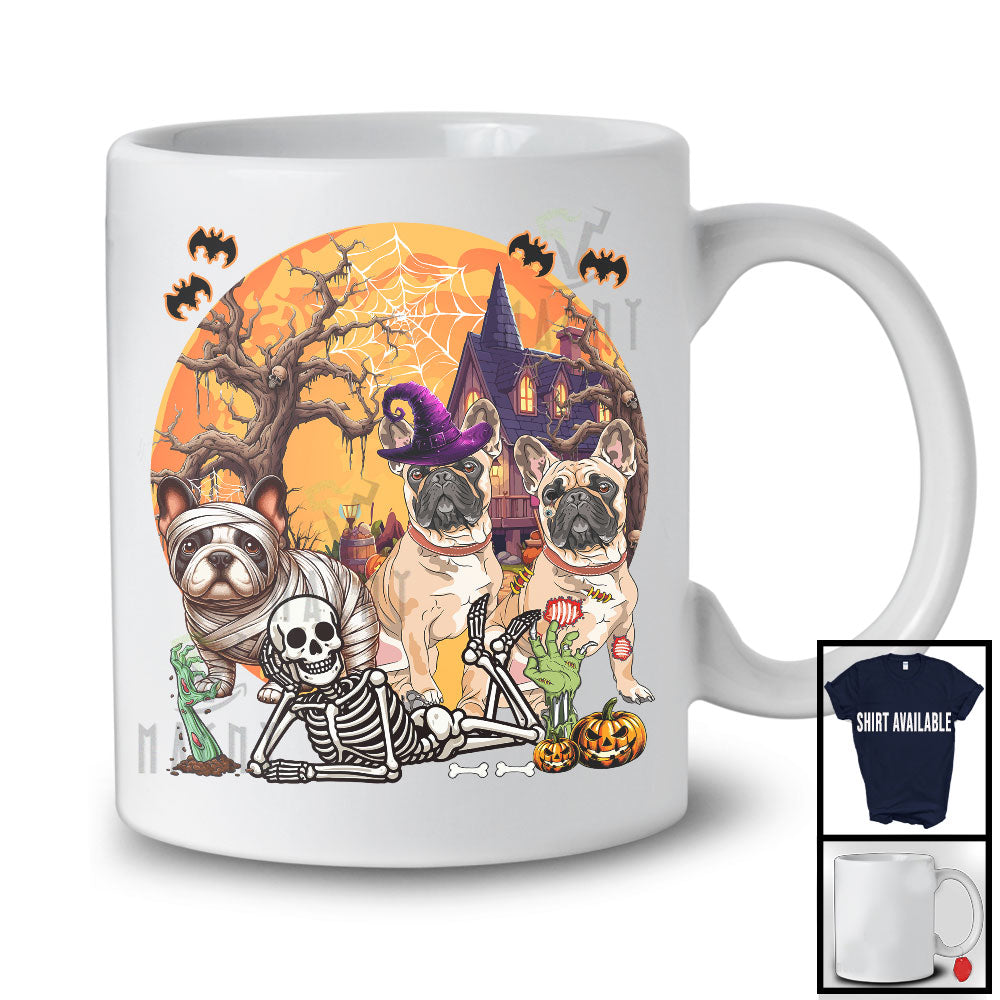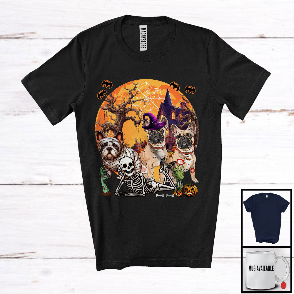 Three Mummy Witch Zombie French Bulldog With Scary Moon, Creepy Halloween Lying Skeleton T-Shirt