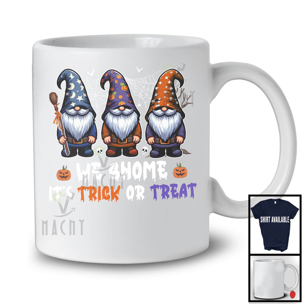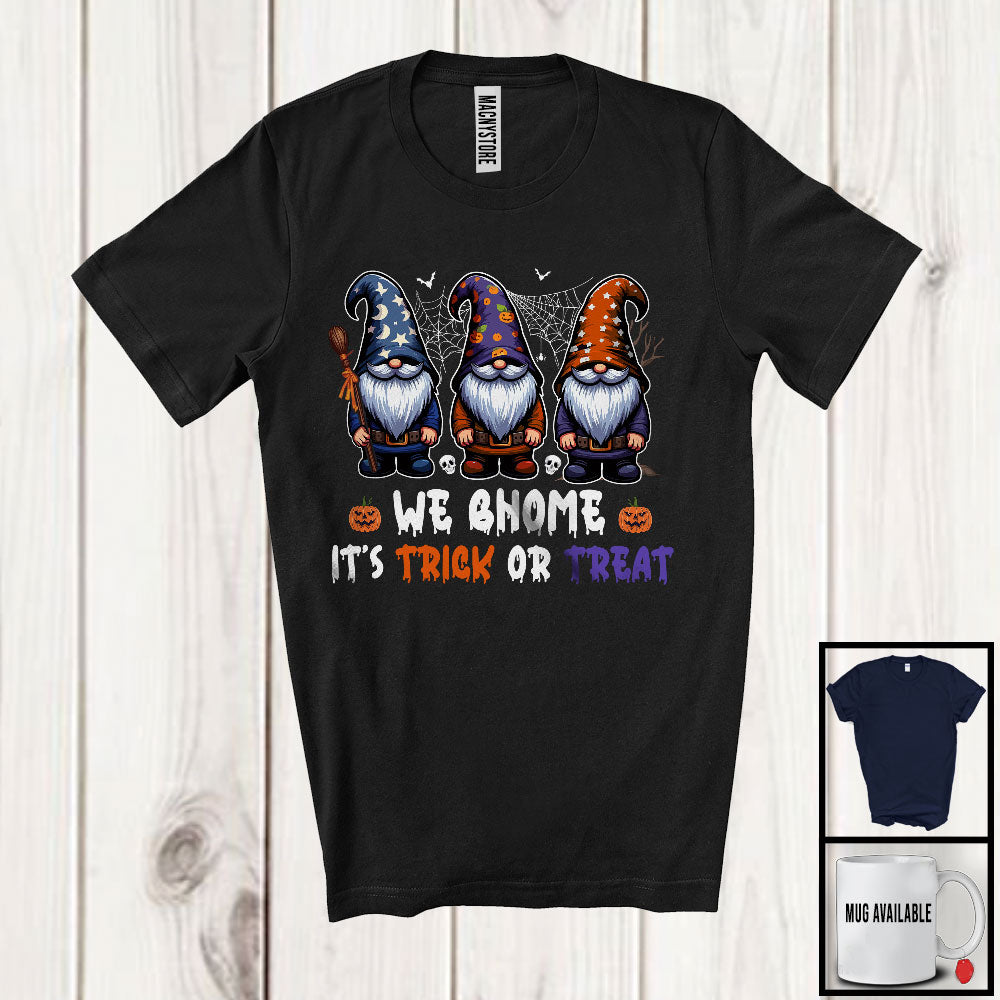 • We Gnome It's Trick Or Treat, Humorous Halloween Three Gnomes As Witch, Family Group T-Shirt. This cotton t-shirt is a durable staple product with a classic fit. One of the most popular items, it has a relaxed style made for everyday and casual wear.